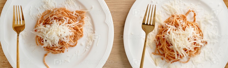 Две тарелки спагетти-пасты, покрытые гребенчатым сыром на деревянном столе