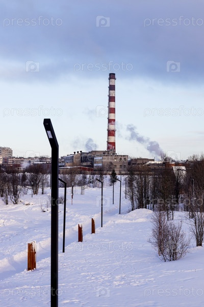 Путь в снегу и тепловые трубы в городе Кандалакша