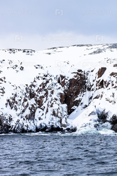 Снежный скалистый берег Баренцева моря в Терьберке