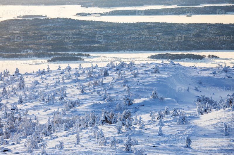 Вид с воздуха на заснеженный склон холма и острова в заливе