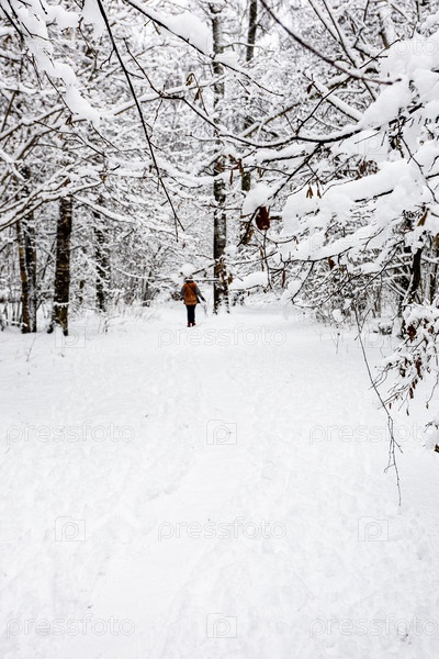Женщина на заснеженной дорожке в снежном лесу