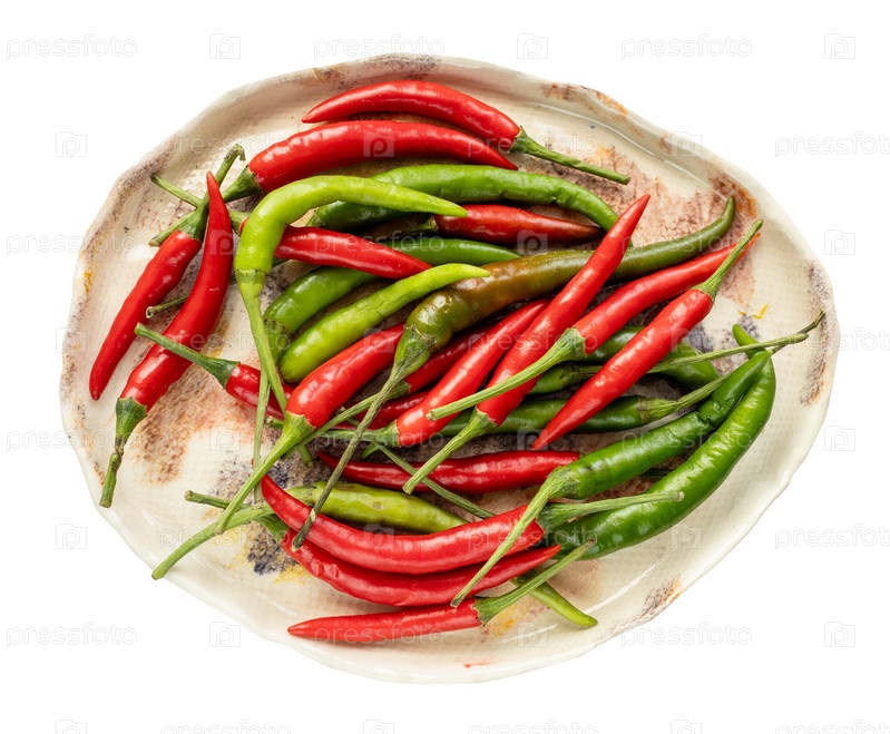 Птичий глаз чили-перец на керамической тарелке изолирован