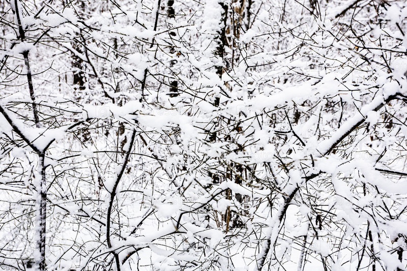 Покрытые снегом запутанные ветви деревьев в лесу парка