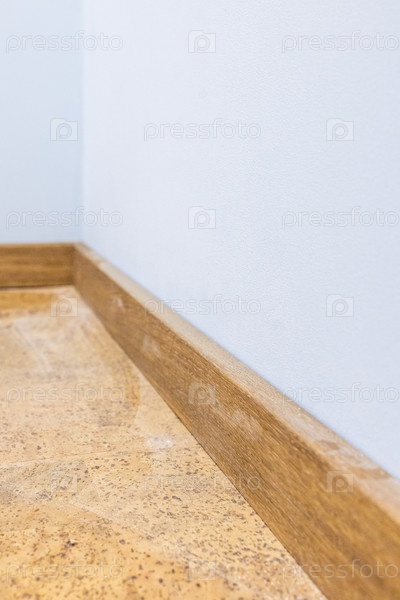 wooden baseboard on new wood cork tiles on floor деревянная подставка на новой древесной пробке на полу
