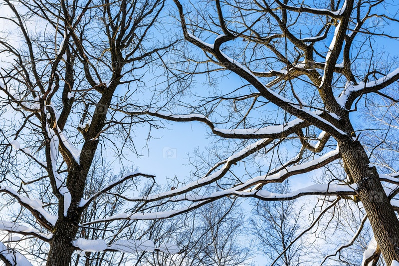 Ниже вид покрытых снегом ветвей деревьев в лесу