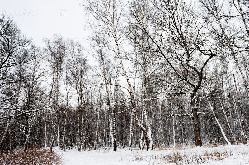 Заснеженная береза и дубовая роща городского парка