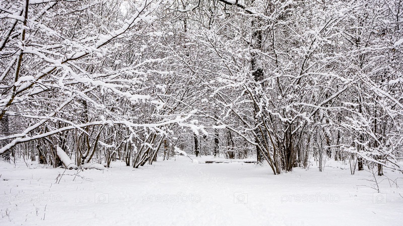 Панорамный вид на широкий снежный путь в парке