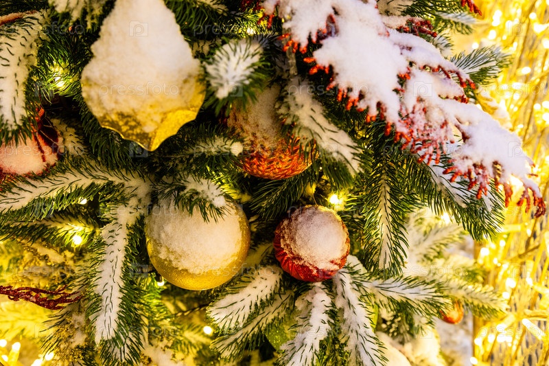 Заснеженный банч рождественской елки с шариками