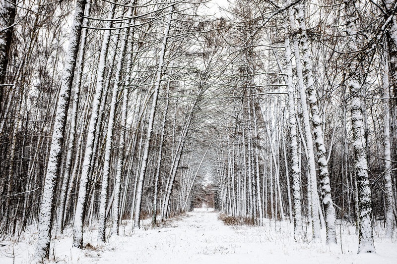 Заснеженная аллея в ларчевой роще в городском парке