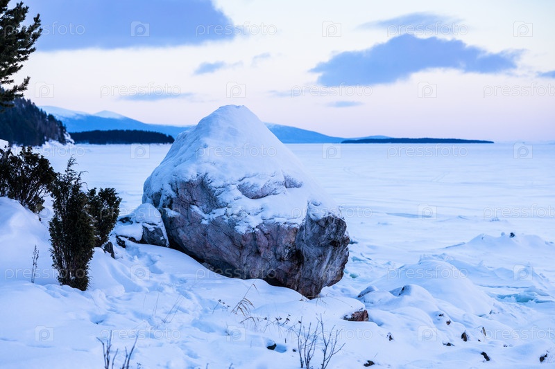 Снежный мемориальный камень на побережье залива Кандалакша