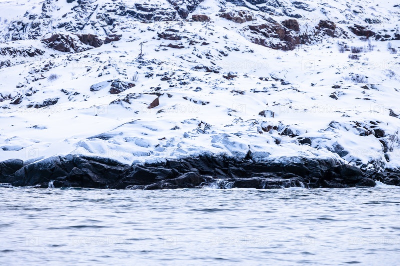 Вид на заснеженное побережье моря с могилой в Терьберке