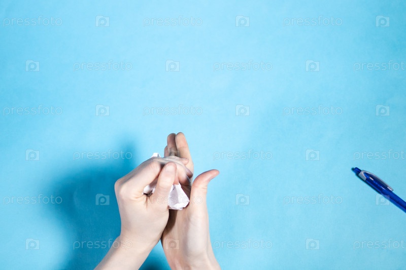 Верхний вид рук, скручивающих мяч на синем