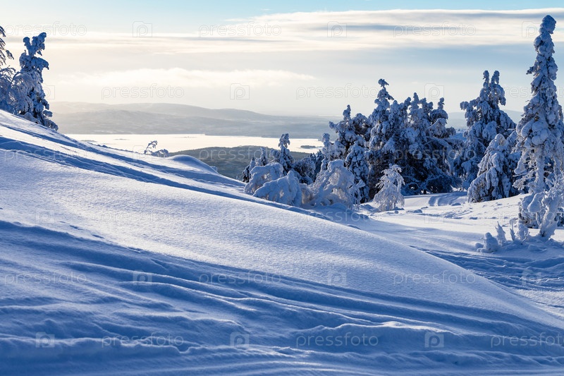 Заснеженный склон холма возле Кандалакши зимой