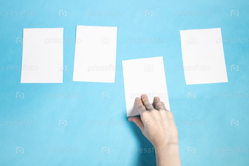 top view of hand takes sheet of white papers верхний вид руки берет лист белых бумаг