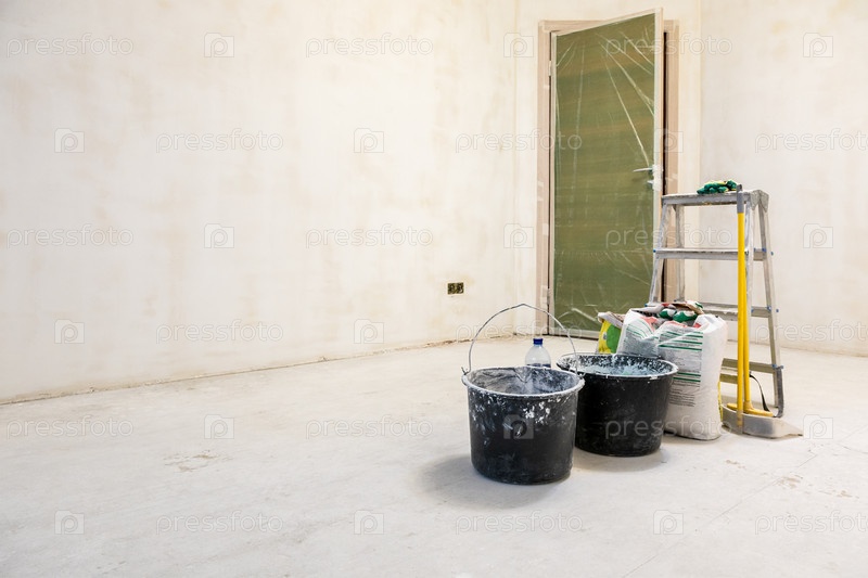 Инструменты штукатуриста в штукатурной комнате с отделкой