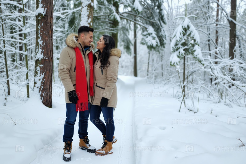 Молодая белая пара улыбается и обнимает природу в снежном зимнем лесу
