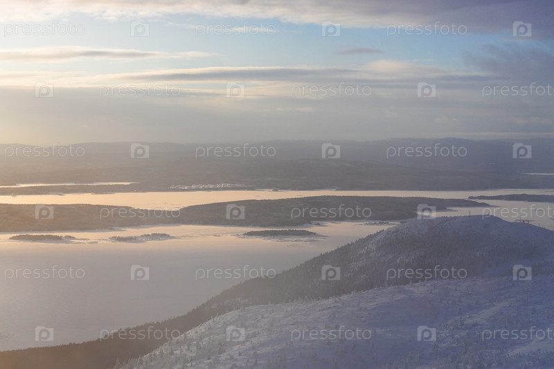 Вид сверху на залив Кандалакша в тумане зимой
