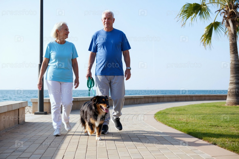 Старшая кавказская пара гуляет с собакой вдоль морской прогулки утром