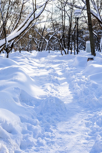 Поверхность пешеходной тропы, на которой ступают снежные заносы в парке
