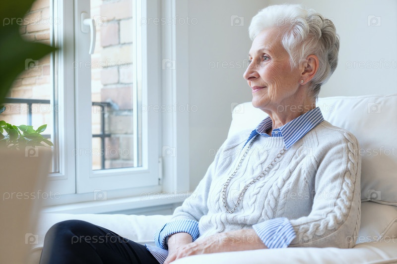 Старшая белая женщина сидит в помещении и улыбается, глядя из окна