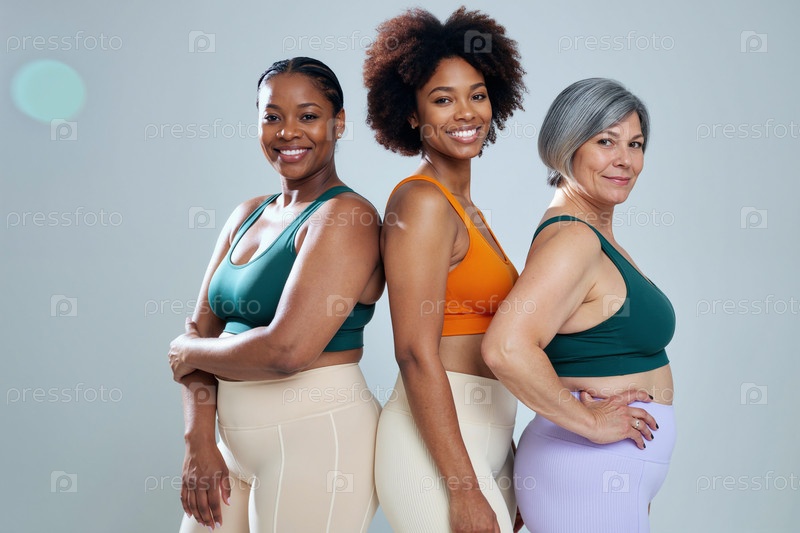 Мультиэтнические женщины разного возраста улыбаются и стоят спиной к спине