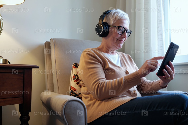 Старшая белая женщина, сидящая в кресле с помощью планшета и слушающая музыку