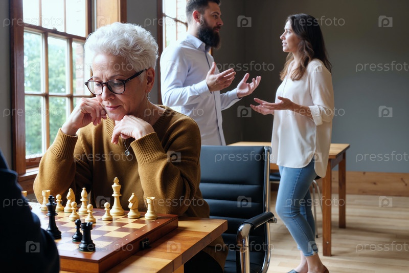 Кавказская женщина играет в шахматы, пока молодые взрослые спорят на заднем плане