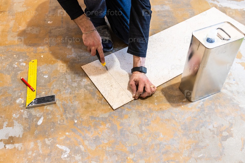 Рабочий режет пробковые плитки для укладки пробкового напольного покрытия