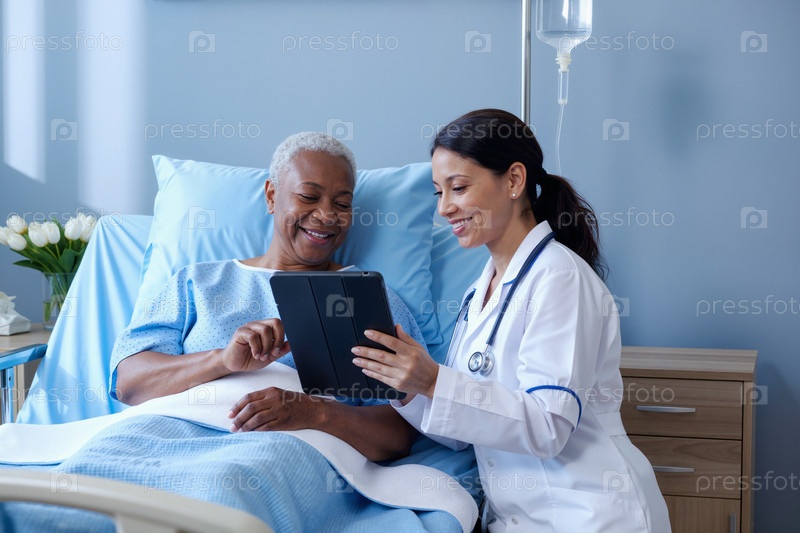 Черная женщина, лежащая в больничной постели Консультации молодых взрослых старших женщин-врачей