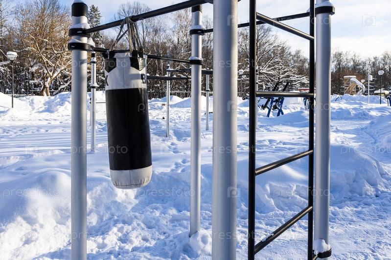 Боксерский мешок на снежном открытом спортивном поле