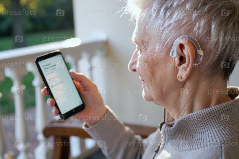 Старшая кавказская женщина использует смартфон с слуховым аппаратом на крыльце