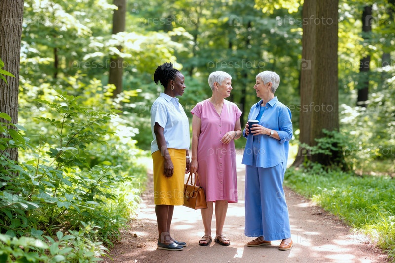 Разнообразная группа пожилых женщин, беседующих вместе в лесном парке