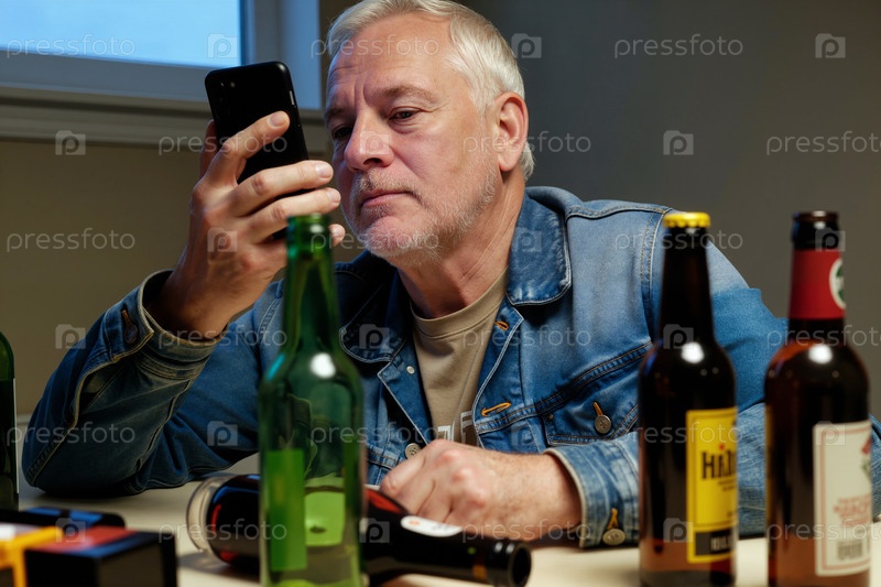Старший белый мужчина сидит за столом, используя смартфон в окружении бутылок
