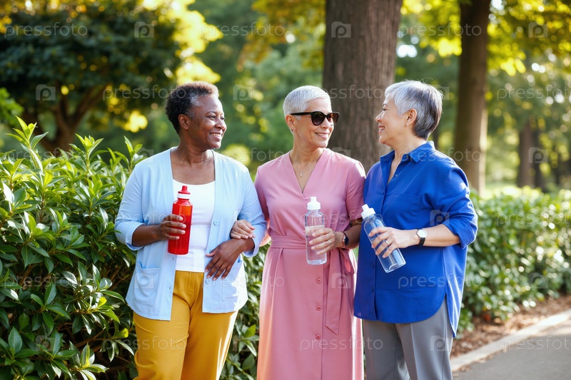 Мультиэтнические женщины, гуляющие на улице и улыбающиеся вместе в парке