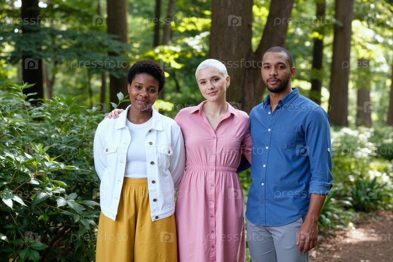Мультиэтнические молодые взрослые объединяются, стоя вместе в лесу