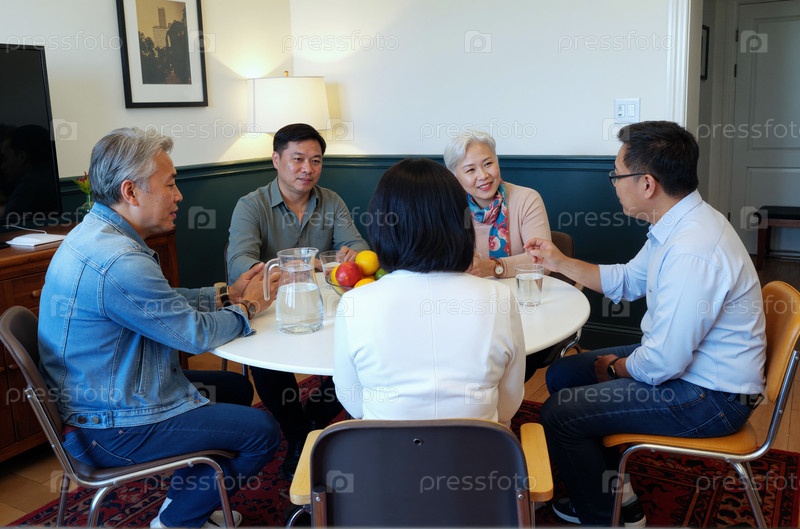 Группа средних и старших азиатских взрослых, ведущих беседы за столом