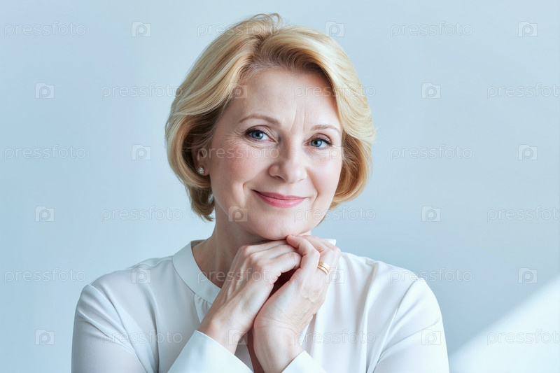 Портрет белокожей женщины среднего возраста, улыбающейся и отдыхающей подбородком на руках