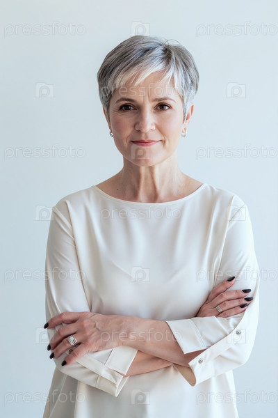 Вертикаль уверенной средневековой белой женщины, улыбающейся с перекрещенными руками