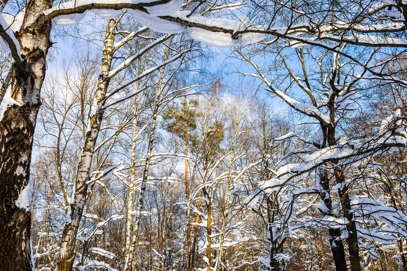 Ветви и вершины сосновых деревьев в снежном лесу