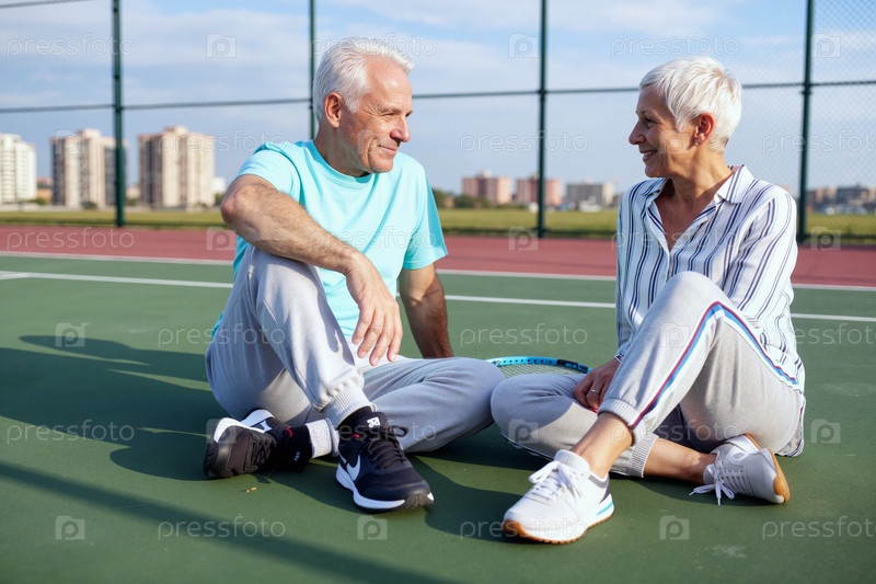 Старшая белая пара сидит на теннисном корте, отдыхая после игры в матч