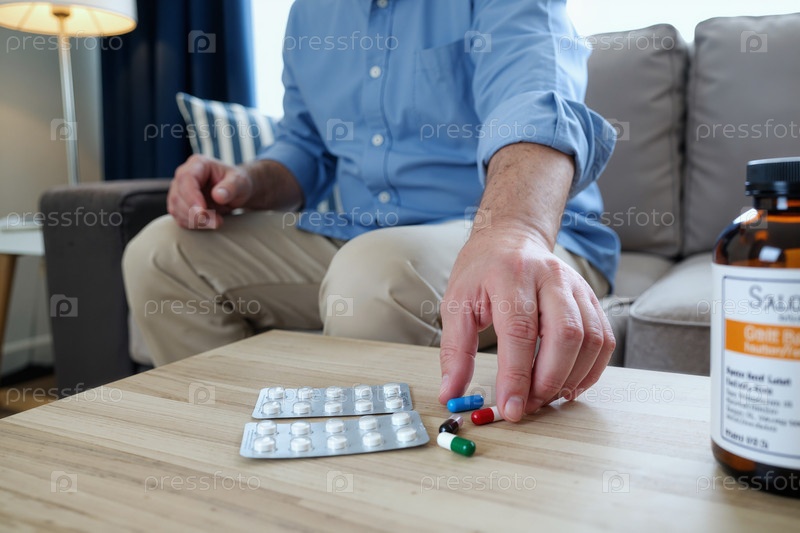 Белый мужчина средних лет принимает таблетки со стола, сидя в помещении