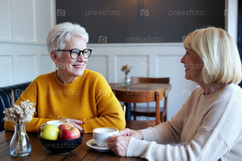 Старшие белые женщины улыбаются и разговаривают, сидя за столом в кафе