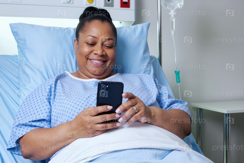 Чернокожая женщина среднего возраста улыбается, используя смартфон в больничной кровати