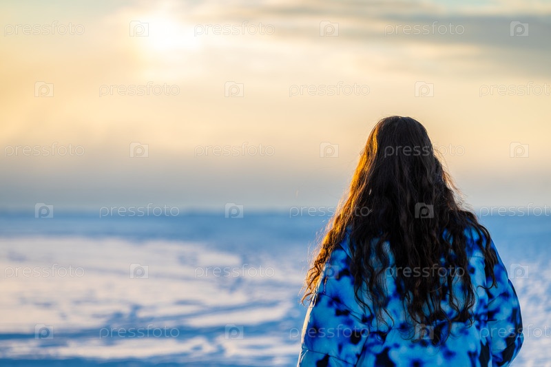tourist looks on frozen bay на зимнем восходе солнца