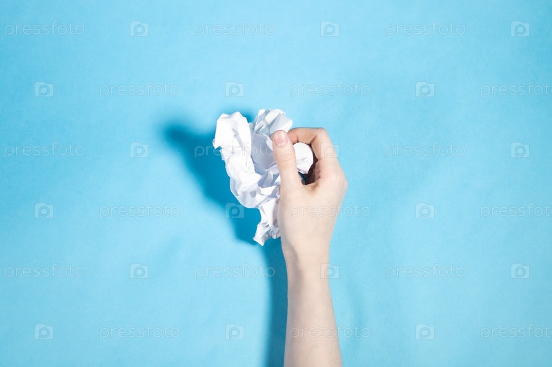 top view of hand holds ball of crumpled paper верхний вид руки держит шар свернутой бумаги