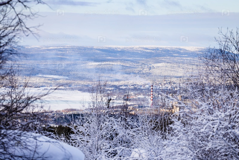 Вид сверху на Кандалакшанский залив возле города зимой