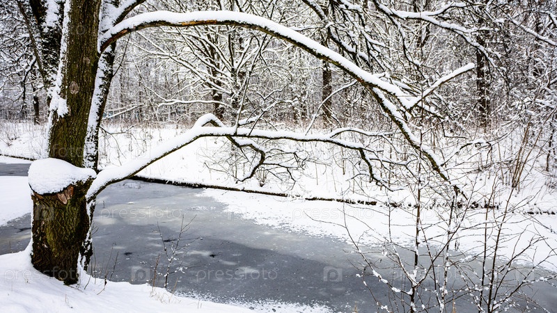 Заснеженная ветвь дерева над замерзшей рекой в парке