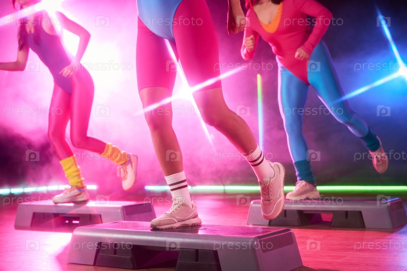 Группа молодых взрослых женщин, выполняющих упражнения на ступенчатых платформах в фитнес-студии