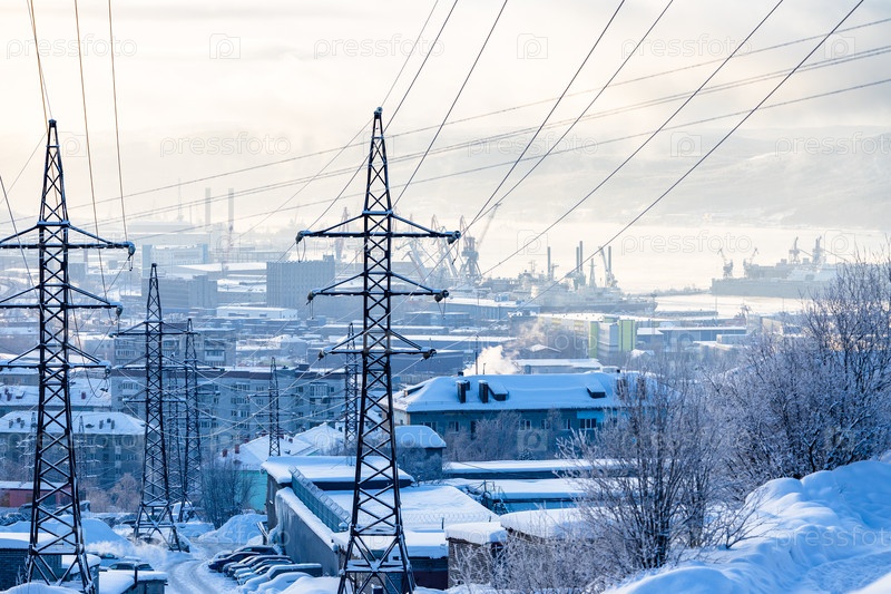 Горизонт заснеженного города Мурманска зимой