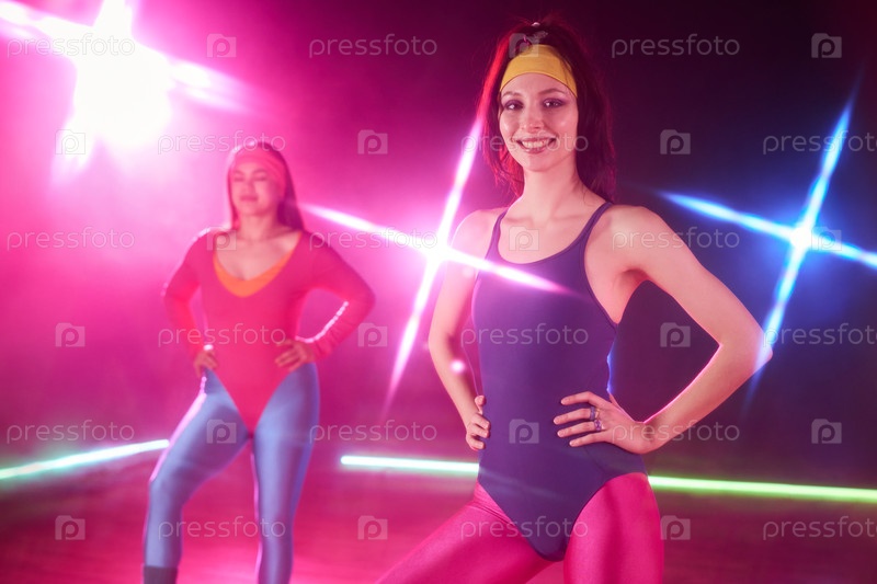 Молодые женщины, улыбающиеся во время тренировок в ретро фитнес-студии